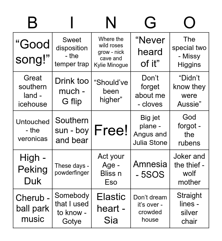 This bingo card has a free space and 24 words: These days - powderfinger, Somebody that I used to know - Gotye, “Should’ve been higher”, Cherub - ball park music, The special two - Missy Higgins, “Good song!”, Great southern land - icehouse, Sweet disposition - the temper trap, Big jet plane - Angus and Julia Stone, Act your Age - Bliss n Eso, Don’t forget about me - cloves, Untouched - the veronicas, Amnesia - 5SOS, Joker and the thief - wolf mother, Drink too much - G flip, Don’t dream it’s over - crowded house, God forgot - the rubens, Where the wild roses grow - nick cave and Kylie Minogue, “Didn’t know they were Aussie”, Southern sun - boy and bear, Straight lines - silver chair, High - Peking Duk, “Never heard of it” and Elastic heart - Sia.