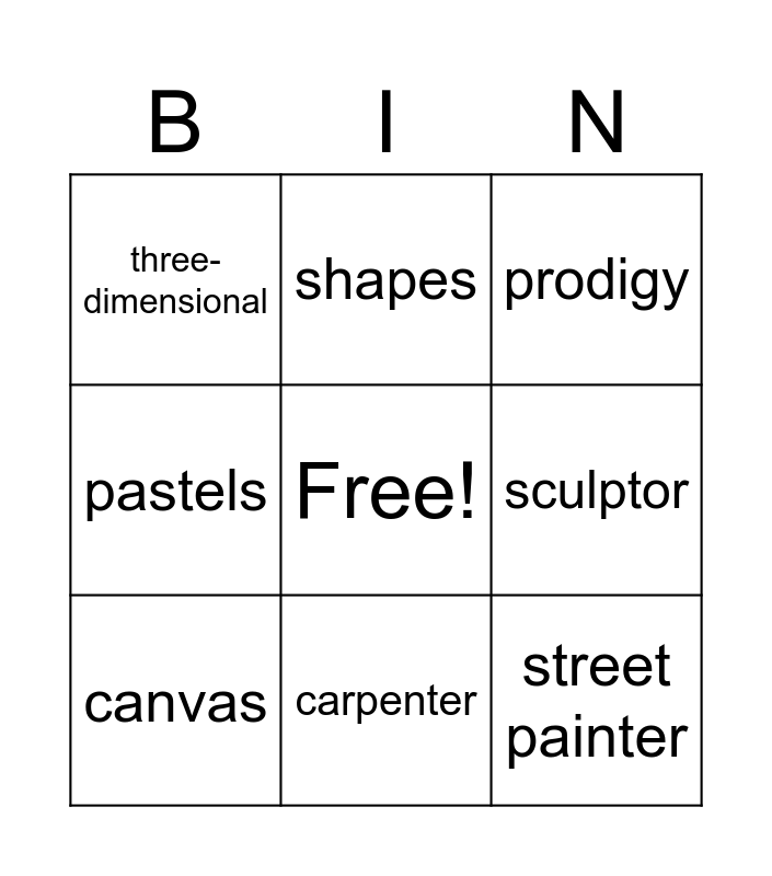 This bingo card has a free space and 11 words: sketch, carpenter, street painter, canvas, shapes, prodigy, sculptor, string, pastels, three-dimensional and paintbrushes.