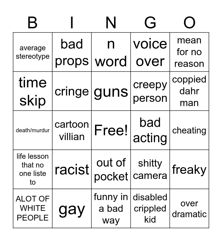 This bingo card has a free space and 24 words: racist, gay, guns, ALOT OF WHITE PEOPLE, mean for no reason, average stereotype, time skip, bad props, bad acting, out of pocket, creepy person, death/murdur, shitty camera, freaky, cringe, disabled crippled kid, cheating, n word, coppied dahr man, cartoon villian, over dramatic, life lesson that no one liste to, voice over and funny in a bad way.