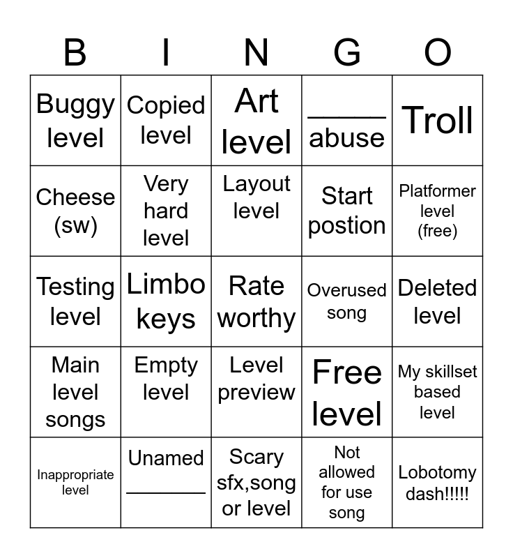 This bingo card has a free space and 24 words: Empty level, Unamed _______, Layout level, Inappropriate level, Troll, Buggy level, Cheese (sw), Copied level, Overused song, Level preview, Start postion, Testing level, Free level, My skillset based level, Very hard level, Not allowed for use song, Deleted level, Art level, Platformer level (free), Limbo keys, Lobotomy dash!!!!!, Main level songs, _____ abuse and Scary sfx,song or level.