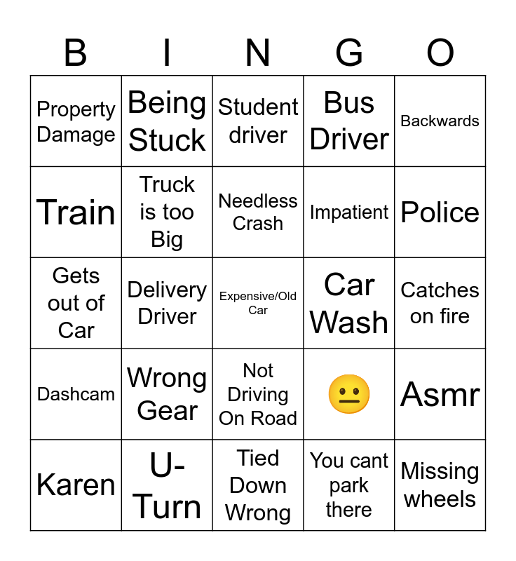 This bingo card has 25 words: Wrong Gear, Tied Down Wrong, Needless Crash, Karen, Backwards, Property Damage, Train, Being Stuck, Car Wash, Not Driving On Road, Impatient, Gets out of Car, 😐, Asmr, Truck is too Big, Missing wheels, Catches on fire, Student driver, Police, Delivery Driver, Expensive/Old Car, U-Turn, Dashcam, Bus Driver and You cant park there.