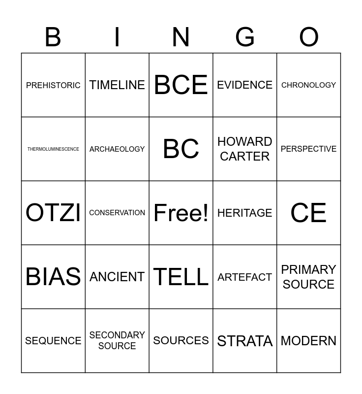 This bingo card has a free space and 36 words: AD, AGE, ANACHRONISM, ARCHAEOLOGY, ARTEFACT, BIAS, BC, CENTURY, CHRONOLOGY, CIVILISATION, CONSERVATION, EVIDENCE, GENERATION, HERITAGE, PERSPECTIVE, PREHISTORIC, MEDIEVAL, ANCIENT, MODERN, BCE, CE, PRIMARY SOURCE, SECONDARY SOURCE, SEQUENCE, SOURCES, TIMELINE, OTZI, TUTANKHAMUN, HOWARD CARTER, THERMOLUMINESCENCE, CARBON DATING, DENDROCHRONOLOGY, STRATA, TELL, MIDDEN and MUNGO MAN.