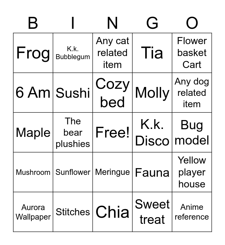 This bingo card has a free space and 24 words: Sunflower, Stitches, Cozy bed, Aurora Wallpaper, Flower basket Cart, Frog, 6 Am, K.k. Bubblegum, K.k. Disco, Meringue, Molly, Maple, Fauna, Yellow player house, Sushi, Sweet treat, Bug model, Any cat related item, Any dog related item, The bear plushies, Anime reference, Mushroom, Tia and Chia.