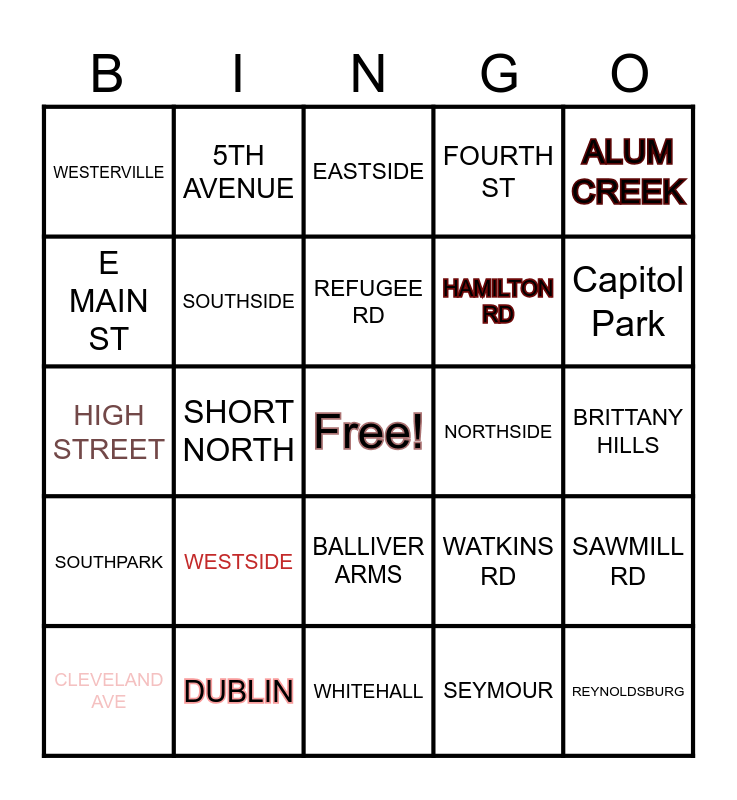 This bingo card has a free space and 29 words: CLEVELAND AVE, LIVINGSTON AVE, SHORT NORTH, HILL TOP, WESTERVILLE, EASTSIDE, SOUTHSIDE, WESTSIDE, NORTHSIDE, DUBLIN, BRITTANY HILLS, REYNOLDSBURG, WHITEHALL, SEYMOUR, Capitol Park, LINCOLN PARK, BALLIVER ARMS, SOUTHPARK, ALUM CREEK, HIGH STREET, WATKINS RD, BRICE RD, HAMILTON RD, E MAIN ST, FOURTH ST, 5TH AVENUE, SAWMILL RD, REFUGEE RD and JOYCE AVENUE.