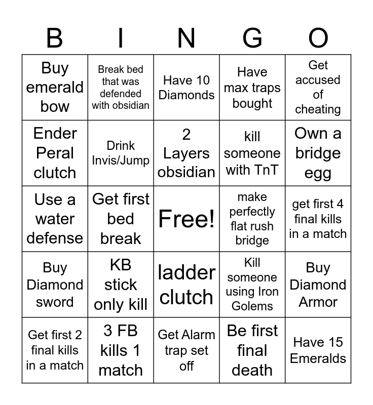 This bingo card has a free space and 24 words: KB stick only kill, 3 FB kills 1 match, 2 Layers obsidian, Get first 2 final kills in a match, Get accused of cheating, Buy emerald bow, Ender Peral clutch, Break bed that was defended with obsidian, make perfectly flat rush bridge, ladder clutch, kill someone with TnT, Use a water defense, Kill someone using Iron Golems, Buy Diamond Armor, Drink Invis/Jump, Be first final death, get first 4 final kills in a match, Have 10 Diamonds, Own a bridge egg, Get first bed break, Have 15 Emeralds, Buy Diamond sword, Have max traps bought and Get Alarm trap set off.