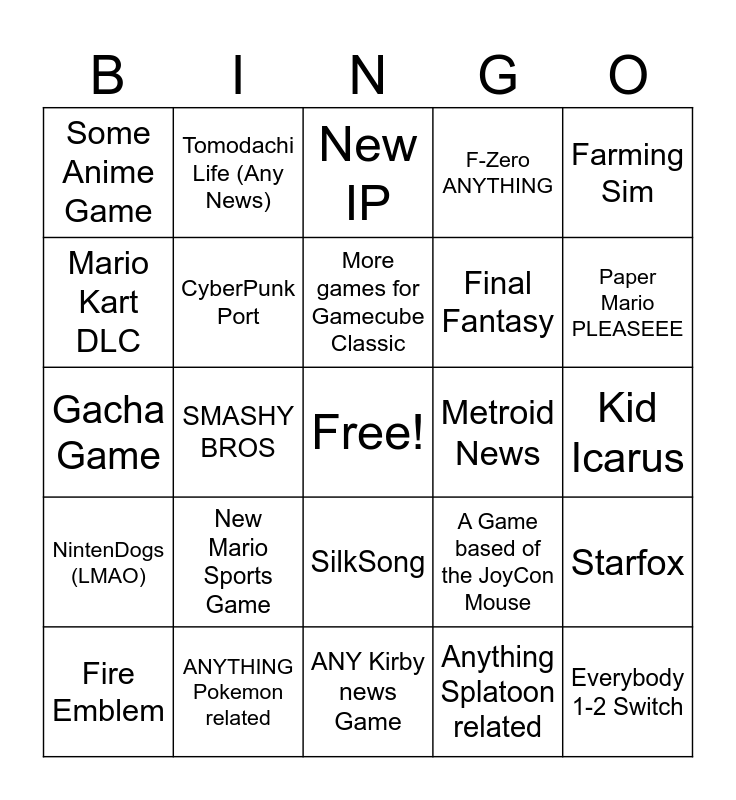 This bingo card has a free space and 24 words: New Mario Sports Game, ANYTHING Pokemon related, More games for Gamecube Classic, Fire Emblem, Farming Sim, Some Anime Game, Mario Kart DLC, Tomodachi Life (Any News), Metroid News, SilkSong, Final Fantasy, Gacha Game, A Game based of the JoyCon Mouse, Starfox, CyberPunk Port, Anything Splatoon related, Kid Icarus, New IP, Paper Mario PLEASEEE, SMASHY BROS, Everybody 1-2 Switch, NintenDogs (LMAO), F-Zero ANYTHING and ANY Kirby news Game.