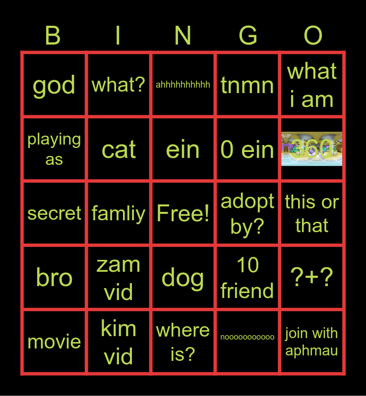 This bingo card has 1 images, a free space and 24 words: zam vid, kim vid, ein, movie, what i am, god, playing as, what?, adopt by?, dog, 0 ein, secret, 10 friend, ?+?, cat, nooooooooooo, this or that, ahhhhhhhhhh, 360, famliy, join with aphmau, bro, tnmn and where is?.