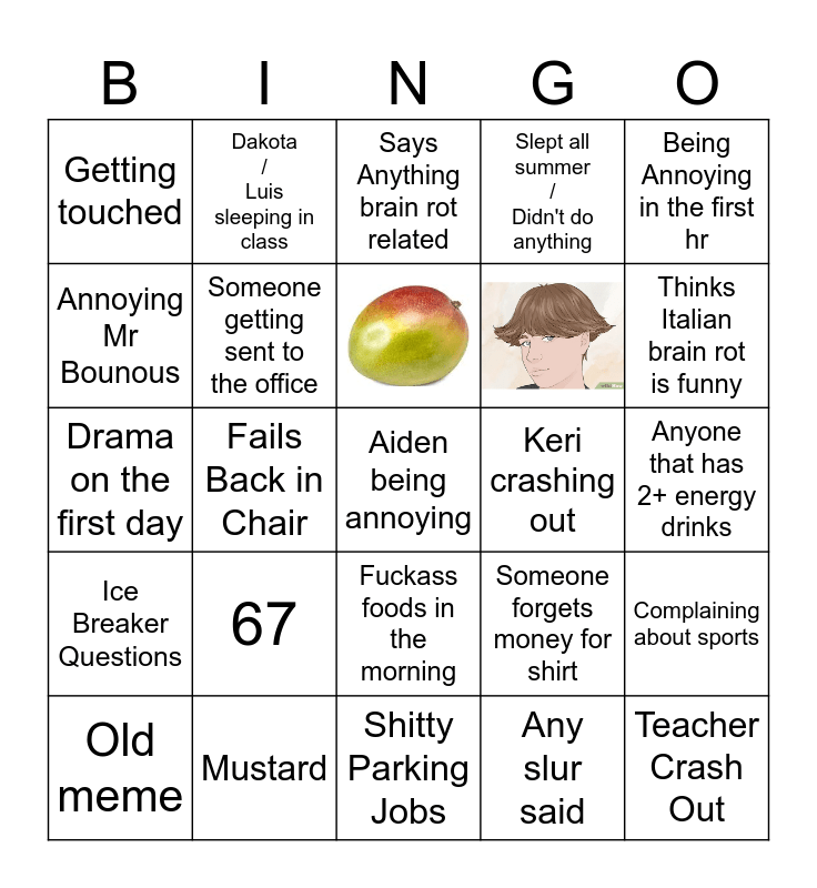 This bingo card has 2 images, a free space and 22 words: 67, Mustard, Old meme, Being Annoying in the first hr, Getting touched, Annoying Mr Bounous, Dakota / Luis sleeping in class, Keri crashing out, Fuckass foods in the morning, Drama on the first day, Someone forgets money for shirt, Complaining about sports, Someone getting sent to the office, Any slur said, Anyone that has 2+ energy drinks, Says Anything brain rot related, Thinks Italian brain rot is funny, Fails Back in Chair, Teacher Crash Out, Ice Breaker Questions, Slept all summer / Didn't do anything and Shitty Parking Jobs.
