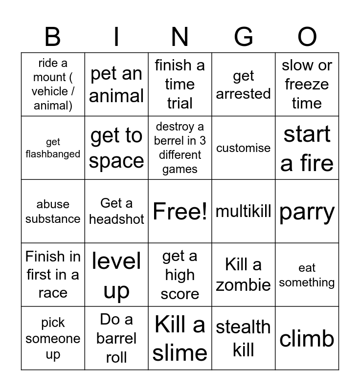 This bingo card has a free space and 31 words: Kill a slime, earn currency, Get a headshot, die, ride a mount ( vehicle / animal), finish a time trial, get to space, Kill a zombie, multikill, stealth kill, parry, climb, drift for 10 seconds, get a pickup, start a fire, blow yourself up, eat something, level up, Finish in first in a race, get a high score, slow or freeze time, win a mini game, pick someone up, pet an animal, customise, get flashbanged, get arrested, abuse substance, Do a barrel roll, destroy a berrel in 3 different games and Score 250,000 points.