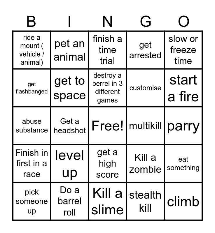 This bingo card has a free space and 31 words: Kill a slime, earn currency, Get a headshot, die, ride a mount ( vehicle / animal), finish a time trial, get to space, Kill a zombie, multikill, stealth kill, parry, climb, drift for 10 seconds, get a pickup, start a fire, blow yourself up, eat something, level up, Finish in first in a race, get a high score, slow or freeze time, win a mini game, pick someone up, pet an animal, customise, get flashbanged, get arrested, abuse substance, Do a barrel roll, destroy a berrel in 3 different games and Score 250,000 points.