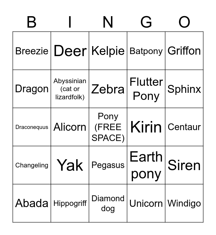 This bingo card has a free space and 24 words: Yak, Hippogriff, Zebra, Abada, Griffon, Breezie, Dragon, Deer, Kirin, Pegasus, Flutter Pony, Draconequus, Earth pony, Siren, Abyssinian (cat or lizardfolk), Unicorn, Centaur, Kelpie, Sphinx, Alicorn, Windigo, Changeling, Batpony and Diamond dog.