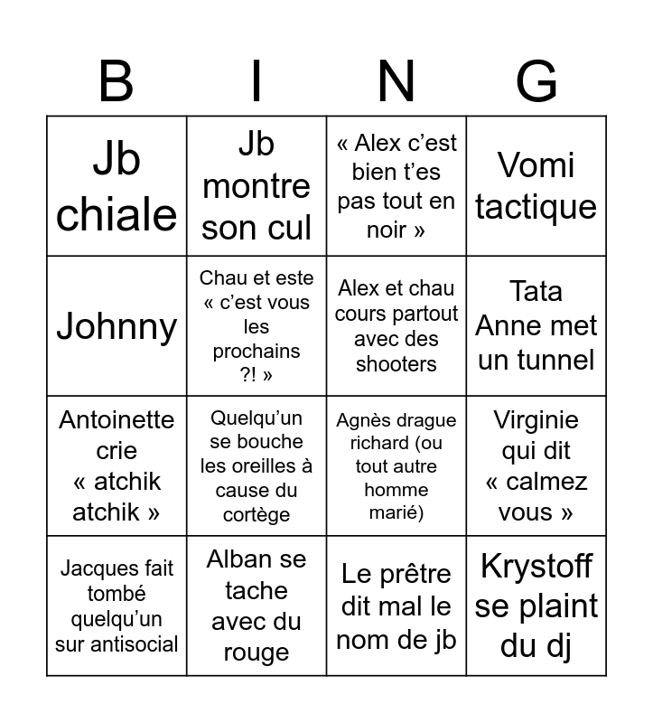 This bingo card has 16 words: Alban se tache avec du rouge, Virginie qui dit « calmez vous », « Alex c’est bien t’es pas tout en noir », Jb chiale, Antoinette crie « atchik atchik », Jb montre son cul, Agnès drague richard (ou tout autre homme marié), Le prêtre dit mal le nom de jb, Johnny, Chau et este « c’est vous les prochains ?! », Jacques fait tombé quelqu’un sur antisocial, Vomi tactique, Quelqu’un se bouche les oreilles à cause du cortège, Tata Anne met un tunnel, Alex et chau cours partout avec des shooters and Krystoff se plaint du dj.