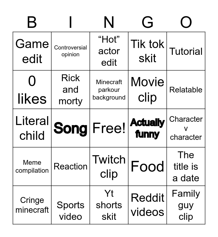 This bingo card has a free space and 24 words: Reaction, Sports video, Minecraft parkour background, Cringe minecraft, Tutorial, Game edit, 0 likes, Controversial opinion, Actually funny, Twitch clip, Movie clip, Literal child, Food, The title is a date, Rick and morty, Reddit videos, Character v character, “Hot” actor edit, Relatable, Song, Family guy clip, Meme compilation, Tik tok skit and Yt shorts skit.