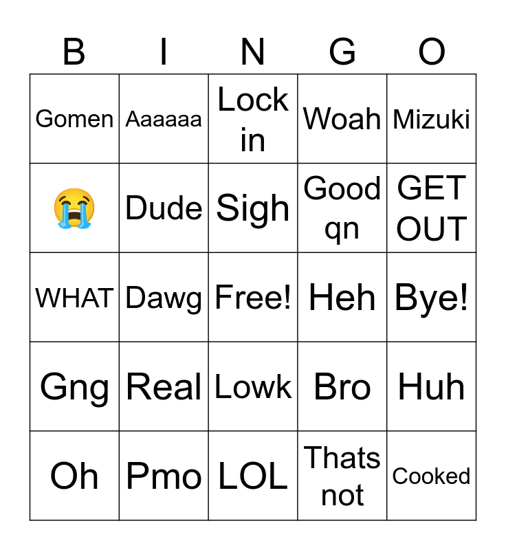 This bingo card has a free space and 24 words: Oh, Real, Sigh, Thats not, Mizuki, Gomen, Aaaaaa, Lock in, Heh, Bye!, WHAT, Dude, Bro, Huh, 😭, Pmo, LOL, Woah, GET OUT, Gng, Dawg, Lowk, Good qn and Cooked.