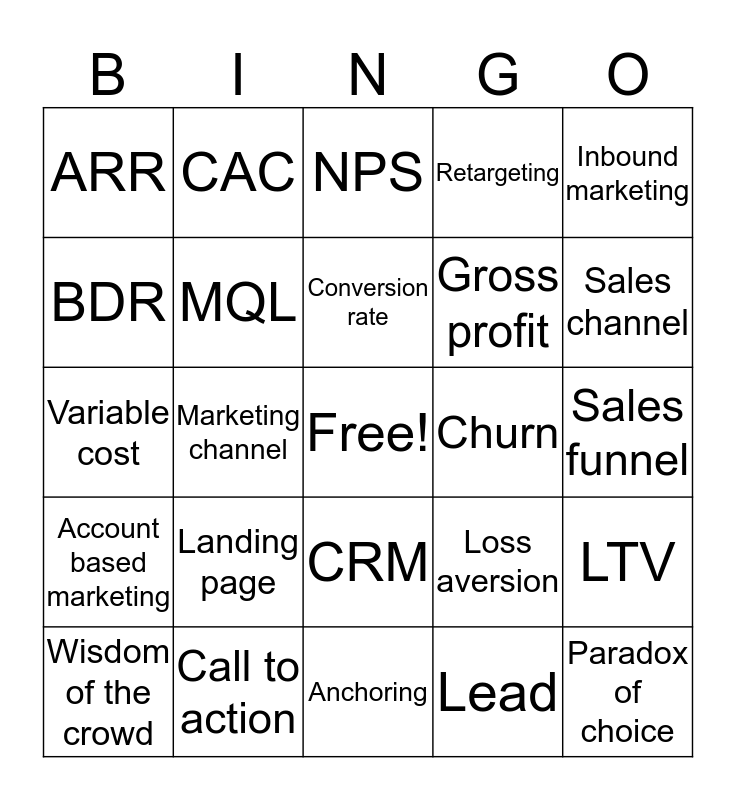 This bingo card has a free space and 24 words: Landing page, Call to action, Conversion rate, Wisdom of the crowd, Inbound marketing, ARR, BDR, CAC, Churn, CRM, Gross profit, Variable cost, Loss aversion, LTV, MQL, Lead, Sales funnel, NPS, Sales channel, Marketing channel, Paradox of choice, Account based marketing, Retargeting and Anchoring.