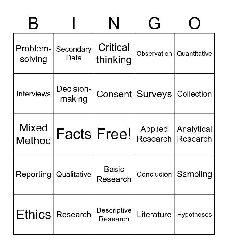 This bingo card has a free space and 30 words: Research, Investigation, Facts, Knowledge, Problem-solving, Critical thinking, Decision-making, Basic Research, Applied Research, Descriptive Research, Analytical Research, Hypotheses, Literature, Data, Collection, Analysis, Conclusion, Reporting, Qualitative, Quantitative, Mixed Method, Primary Data, Secondary Data, Surveys, Interviews, Observation, Sampling, Ethics, Consent and Confidentiality.