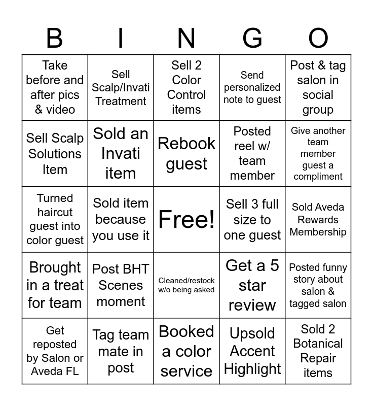 This bingo card has a free space and 24 words: Post BHT Scenes moment, Tag team mate in post, Rebook guest, Get reposted by Salon or Aveda FL, Post & tag salon in social group, Take before and after pics & video, Sell Scalp Solutions Item, Sell Scalp/Invati Treatment, Sell 3 full size to one guest, Cleaned/restock w/o being asked, Posted reel w/ team member, Turned haircut guest into color guest, Get a 5 star review, Posted funny story about salon & tagged salon, Sold an Invati item, Upsold Accent Highlight, Sold Aveda Rewards Membership, Sell 2 Color Control items, Give another team member guest a compliment, Sold item because you use it, Sold 2 Botanical Repair items, Brought in a treat for team, Send personalized note to guest and Booked a color service.