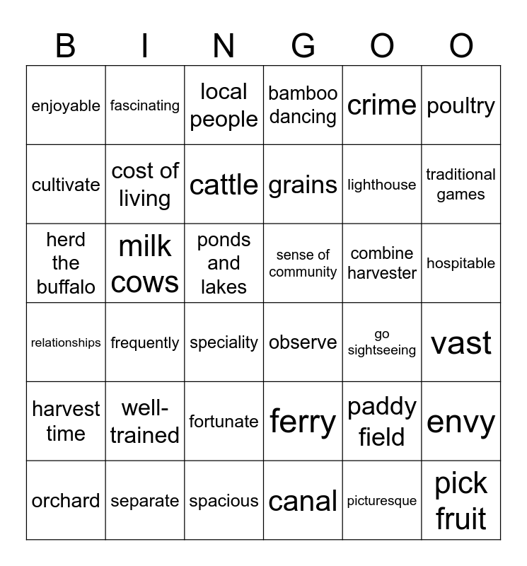 This bingo card has 36 words: ferry, fortunate, canal, cultivate, relationships, sense of community, cost of living, spacious, crime, paddy field, traditional games, bamboo dancing, envy, milk cows, grains, enjoyable, harvest time, combine harvester, herd the buffalo, local people, ponds and lakes, frequently, observe, speciality, go sightseeing, fascinating, lighthouse, separate, cattle, poultry, pick fruit, orchard, vast, hospitable, well-trained and picturesque.