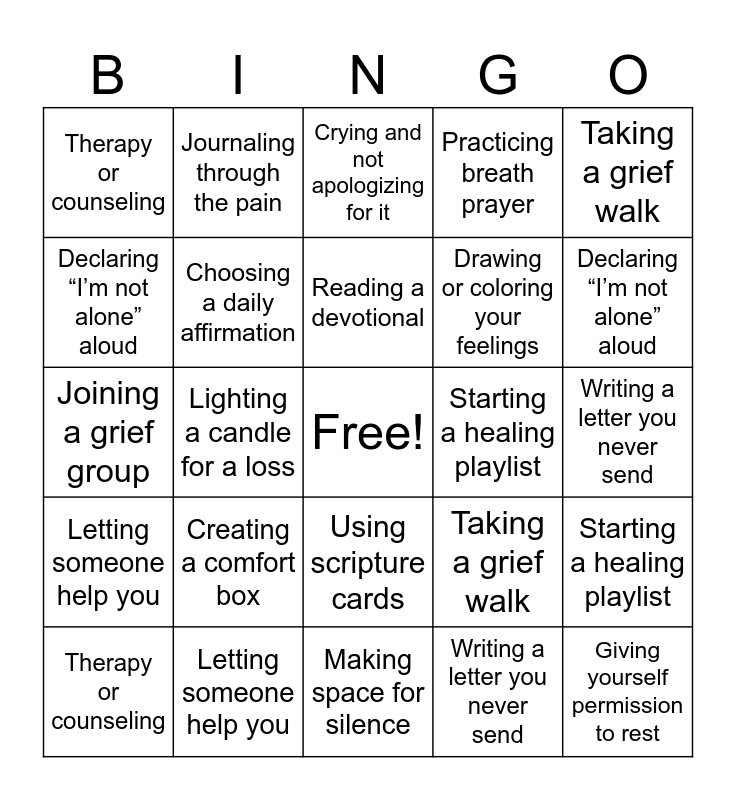 This bingo card has a free space and 44 words: Journaling through the pain, Giving yourself permission to rest, Saying “no” without guilt, Therapy or counseling, Talking to God out loud, Writing a letter you never send, Crying and not apologizing for it, Naming what hurts, Taking a grief walk, Letting someone help you, Practicing breath prayer, Starting a healing playlist, Using scripture cards, Creating a comfort box, Lighting a candle for a loss, Making space for silence, Releasing perfection, Joining a grief group, Reading a devotional, Declaring “I’m not alone” aloud, Journaling through the pain, Giving yourself permission to rest, Saying “no” without guilt, Therapy or counseling, Talking to God out loud, Writing a letter you never send, Crying and not apologizing for it, Naming what hurts, Taking a grief walk, Letting someone help you, Practicing breath prayer, Starting a healing playlist, Using scripture cards, Creating a comfort box, Lighting a candle for a loss, Making space for silence, Releasing perfection, Joining a grief group, Reading a devotional, Declaring “I’m not alone” aloud, Drawing or coloring your feelings, Speaking to your inner child, Choosing a daily affirmation and Drinking water and breathing deeply.