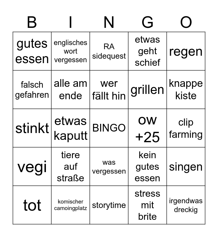 This bingo card has a free space and 24 words: tiere auf straße, komischer camoingplatz, wer fällt hin, tot, regen, gutes essen, falsch gefahren, englisches wort vergessen, ow +25, was vergessen, grillen, stinkt, kein gutes essen, singen, alle am ende, stress mit brite, clip farming, RA sidequest, knappe kiste, etwas kaputt, irgendwas dreckig, vegi, etwas geht schief and storytime.
