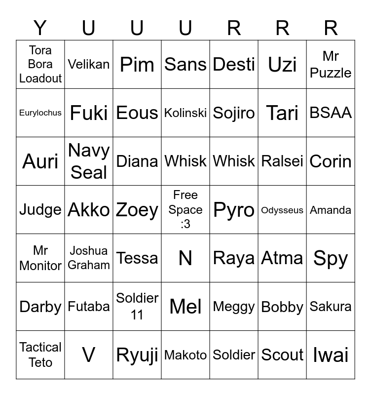This bingo card has a free space and 48 words: Meggy, Tari, Makoto, Akko, Diana, Amanda, Velikan, V, Uzi, N, Mr Puzzle, Sans, Ralsei, Whisk, Darby, Odysseus, Eurylochus, BSAA, Bobby, Desti, Sojiro, Zoey, Tora Bora Loadout, Fuki, Sakura, Eous, Corin, Tactical Teto, Whisk, Navy Seal, Scout, Pyro, Spy, Futaba, Judge, Raya, Atma, Auri, Tessa, Soldier 11, Mr Monitor, Iwai, Pim, Ryuji, Kolinski, Mel, Joshua Graham and Soldier.