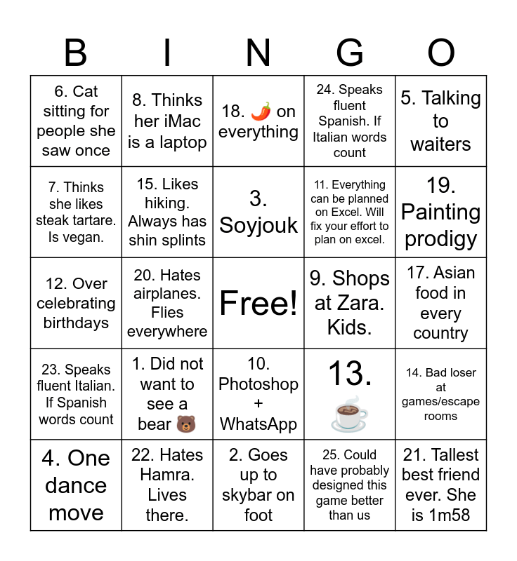 This bingo card has a free space and 25 words: 1. Did not want to see a bear 🐻, 2. Goes up to skybar on foot, 3. Soyjouk, 4. One dance move, 5. Talking to waiters, 6. Cat sitting for people she saw once, 7. Thinks she likes steak tartare. Is vegan., 8. Thinks her iMac is a laptop, 9. Shops at Zara. Kids., 10. Photoshop + WhatsApp, 11. Everything can be planned on Excel. Will fix your effort to plan on excel., 12. Over celebrating birthdays, 13. ☕️, 14. Bad loser at games/escape rooms, 15. Likes hiking. Always has shin splints, 16. Lebanese with a sun allergy, gets tan in 2 minutes, 17. Asian food in every country, 18. 🌶️ on everything, 19. Painting prodigy, 20. Hates airplanes. Flies everywhere, 21. Tallest best friend ever. She is 1m58, 22. Hates Hamra. Lives there., 23. Speaks fluent Italian. If Spanish words count, 24. Speaks fluent Spanish. If Italian words count and 25. Could have probably designed this game better than us.