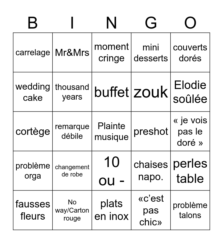 This bingo card has a free space and 24 words: changement de robe, No way/Carton rouge, buffet, fausses fleurs, couverts dorés, carrelage, wedding cake, Mr&Mrs, preshot, 10 ou -, zouk, cortège, chaises napo., perles table, thousand years, «c’est pas chic», « je vois pas le doré », moment cringe, Elodie soûlée, remarque débile, problème talons, problème orga, mini desserts and plats en inox.