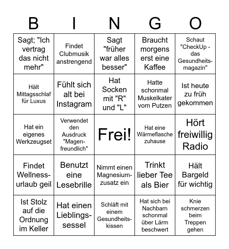 This bingo card has a free space and 34 words: Hat heute Schmerz- mittel dabei, Hat sich bei Nachbarn schonmal über Lärm beschwert, Hat regelmässig Rücken- schmerzen, Kennt die Wetter App besser als Spotify, Findet Wellness- urlaub geil, Fühlt sich alt bei Instagram, Schaut "CheckUp -das Gesundheits- magazin", Ist Stolz auf die Ordnung im Keller, Findet Clubmusik anstrengend, Kann keine Nacht durchmachen, Hat Socken mit "R" und "L", Sagt "früher war alles besser", Geht unter der Woche vor 22 Uhr ins Bett, Kennt seinen Blutdruck, Hat eine Wärmeflasche zuhause, Ist heute zu früh gekommen, Hat einen Lieblings- sessel, Hat ein eigenes Werkzeugset, Benutzt eine Lesebrille, Trinkt lieber Tee als Bier, Nimmt einen Magnesium- zusatz ein, Meckert über WLAN, Sagt; "Ich vertrag das nicht mehr", Hört freiwillig Radio, Schläft mit einem Gesundheits- kissen, Knie schmerzen beim Treppen gehen, Braucht morgens erst eine Kaffee, Diskutiert über Rente - aus Interesse, Hatte schonmal Muskelkater vom Putzen, Hält Mittagsschlaf für Luxus, Sammelt Cumulus- und Superpunkte mit Stolz, Verwendet den Ausdruck "Magen- freundlich", Hält Bargeld für wichtig and Weiss wie man Wäsche vorbehandelt.