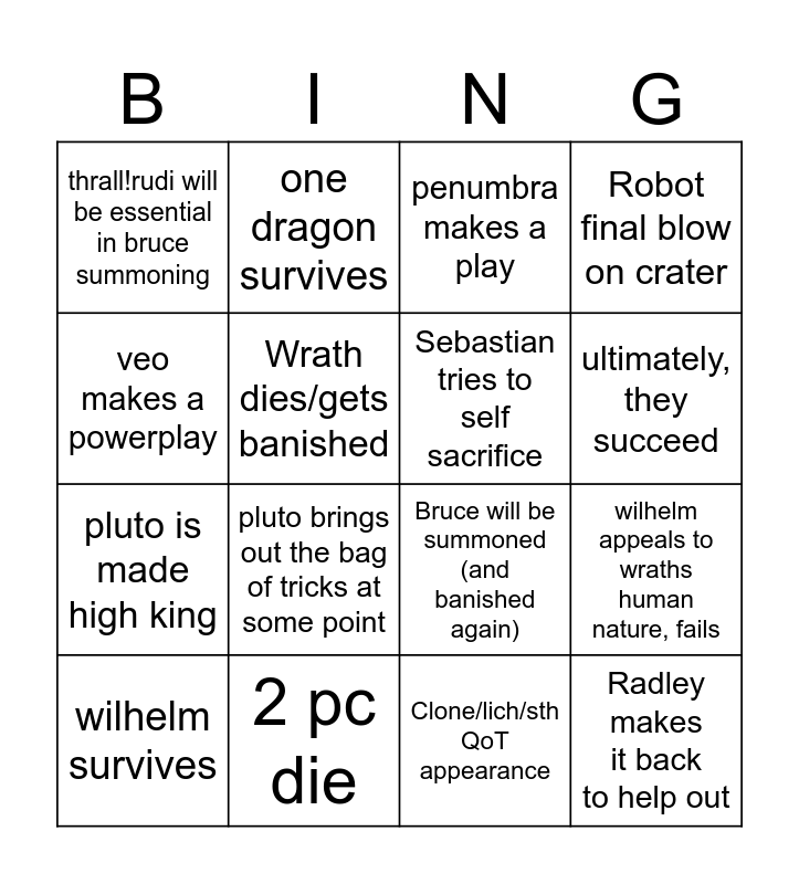 This bingo card has 16 words: 2 pc die, wilhelm appeals to wraths human nature, fails, penumbra makes a play, thrall!rudi will be essential in bruce summoning, pluto is made high king, one dragon survives, Bruce will be summoned (and banished again), Clone/lich/sth QoT appearance, veo makes a powerplay, Wrath dies/gets banished, wilhelm survives, Robot final blow on crater, pluto brings out the bag of tricks at some point, ultimately, they succeed, Sebastian tries to self sacrifice and Radley makes it back to help out.