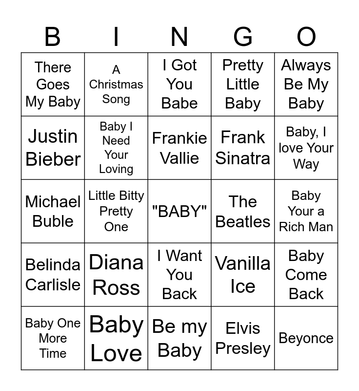 This bingo card has a free space and 24 words: Diana Ross, Baby Love, Frankie Vallie, Baby One More Time, Always Be My Baby, There Goes My Baby, Justin Bieber, A Christmas Song, The Beatles, I Want You Back, Frank Sinatra, Michael Buble, Vanilla Ice, Baby Come Back, Baby I Need Your Loving, Elvis Presley, Baby Your a Rich Man, I Got You Babe, Baby, I love Your Way, Little Bitty Pretty One, Beyonce, Belinda Carlisle, Pretty Little Baby and Be my Baby.