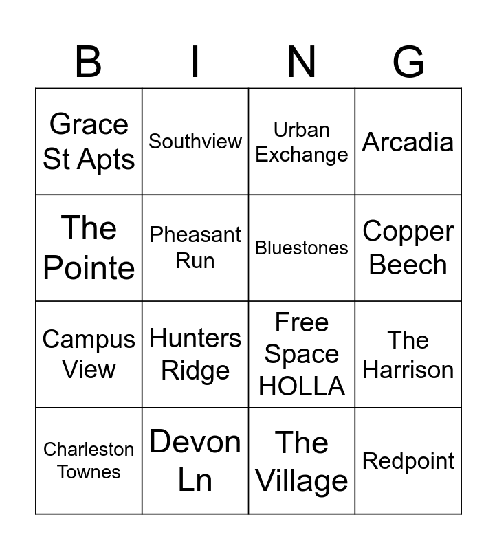 This bingo card has 21 words: Devon Ln, Sunchase, Southview, Northview, The Village, Bluestones, Grace St Apts, Urban Exchange, Free Space HOLLA, Copper Beech, Campus View, Arcadia, Redpoint, East Campus, Pheasant Run, The Cottages, Charleston Townes, Hunters Ridge, The Pointe, The Harrison and The Mill.
