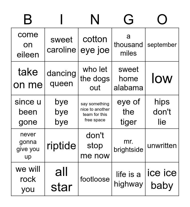 This bingo card has a free space and 30 words: all star, barbie girl, bye bye bye, check yes juliet, come on eileen, cotton eye joe, dancing queen, don't stop me now, eye of the tiger, footloose, hips don't lie, ice ice baby, life is a highway, livin' on a prayer, low, mamma mia, mr. brightside, never gonna give you up, riptide, september, since u been gone, single ladies, sweet caroline, sweet home alabama, take on me, a thousand miles, unwritten, we will rock you, who let the dogs out and ymca.