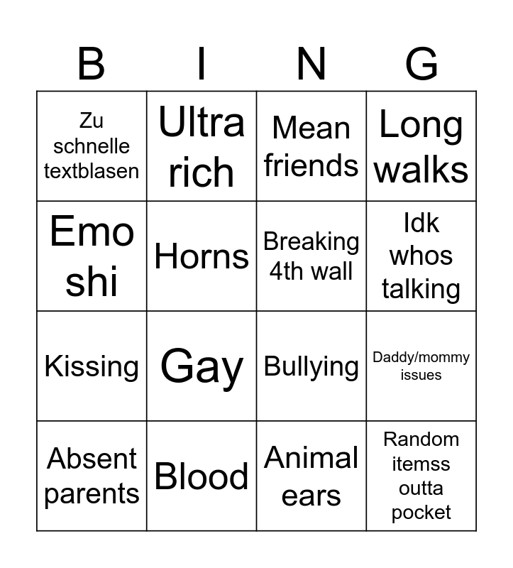 This bingo card has 16 words: Blood, Daddy/mommy issues, Mean friends, Zu schnelle textblasen, Kissing, Ultra rich, Bullying, Animal ears, Emo shi, Horns, Absent parents, Long walks, Gay, Idk whos talking, Breaking 4th wall and Random itemss outta pocket.