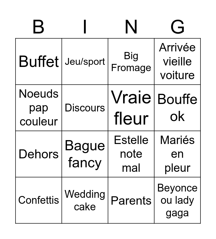 This bingo card has 16 words: Wedding cake, Mariés en pleur, Big Fromage, Buffet, Dehors, Jeu/sport, Estelle note mal, Parents, Noeuds pap couleur, Discours, Confettis, Arrivée vieille voiture, Bague fancy, Bouffe ok, Vraie fleur and Beyonce ou lady gaga.