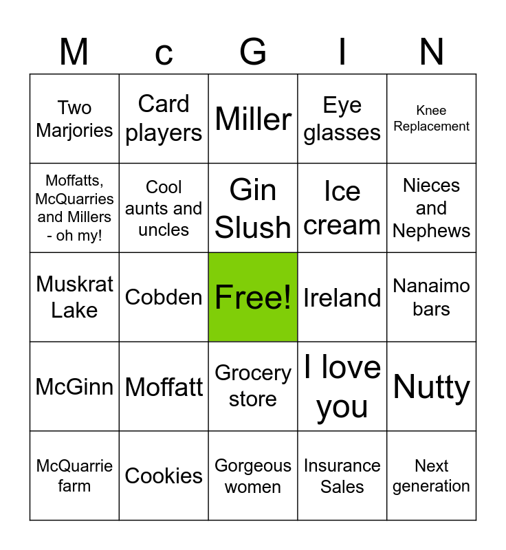 This bingo card has a free space and 28 words: McGinn, Cookies, Gin Slush, Insurance Sales, Knee Replacement, Two Marjories, Cool aunts and uncles, Gorgeous women, Ireland, Nutty, Muskrat Lake, Cobden, I love you, Next generation, Moffatts, McQuarries and Millers - oh my!, Crafty, Grocery store, Eye glasses, Nieces and Nephews, McQuarrie farm, Card players, Grandma, Ice cream, Nanaimo bars, McGinn, Moffatt, Miller and McQuarrie.