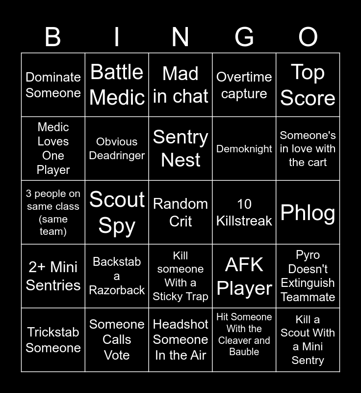 This bingo card has a free space and 45 words: Environmental Kill, Kill a Scout With a Mini Sentry, Land a Crit Market Garden, Trickstab Someone, Light Someone on Fire Via Gas Passer, Hit Someone With the Cleaver and Bauble, Mad in chat, Kill a Sentry By Sapping it, Top Score, Someone Calls Vote, Overtime capture, 10 Killstreak, Kill someone With a Sticky Trap, Backstab a Razorback, Uber a Fellow Medic, Headshot Someone In the Air, Pan Crit Kill, 3 people on same class (same team), Fish Kill, Someone's in love with the cart, Battle Medic, Get Uber'd, Sentry in the spot at last, Dominate Someone, Walking off cliff, Phlog, Item Drop, Auto-Balance, AFK Player, 2+ Mini Sentries, Confused Player, Pyro Doesn't Extinguish Teammate, Gibus, GunSpy, Miss Backstab, Scout Spy, 3+ Killbind, Unusual, Australium Weapon, Sentry Nest, Medic Loves One Player, Demoknight, Get A Kill As Medic, Obvious Deadringer and Get the Most Kills.