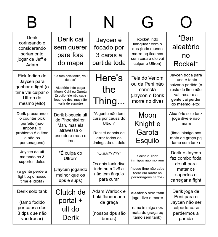 This bingo card has a free space and 24 words: "É culpa do Ultron" (Jaycen jogando melhor que os dps e sups), Clutch de portal + ult do Derik, Here's the Thing..., Derik solo tank (tamo fodido por causa dos 3 dps que não vão trocar), *Ban aleatório no Rocket*, Derik coringando e considerando seriamente jogar de Jeff e Adam, Pick fodido do Jaycen para ganhar a fight (o time vai culpar o Ultron do mesmo jeito), Derik cai sem querer para fora do mapa, Moon Knight e Garota Esquilo, "Cura?????" Os dois tank dive indo num 2v6 e não tem ângulo para curar, Teia do Venom ou da Peni não conecta (Jaycen e Derik morre no dive), Derik procurando o counter pick perfeito (não importa, o problema é o time e não os personagens), Coisa e Thor inimigos não morrem (nosso time não sabe focar em matar os personagens certos), Derik e Jaycen faz combo foda de ult para matar os suportes e carregar a fight, "Já tem dois tanks, vou de dps" Aleatório indo pegar Moon Kight ou Garota Esquilo (ele não sabe jogar de dps, mas não vai ir de suporte), Aleatório solo tank joga dive e morre (time inimigo nos mata de graça pq tamo sem tank), Aleatório solo tank joga dive e não morre (time inimigo nos mata de graça pq tamo sem tank), Jaycen é focado por 3 caras a partida toda, Jaycen troca para Luna e tenta salvar a partida (o resto do time não vai trocar e a gente vai perder do mesmo jeito), Derik bloqueia ult de Phoenix/Iron Man, mas ela atravessa o escudo e mata o time, Derik joga de Peni para o Jaycen não ser culpado caso perdermos a partida, Jaycen de ult matando os 3 suportes deles (a gente perde a fight pq o nosso time é idiota), Rocket indo flanquear com o dps (todo mundo morre pq ficamos sem cura e ele vai culpar o Ultron) and Adam Warlock e Loki flanqueado de graça (nossos dps são burros).