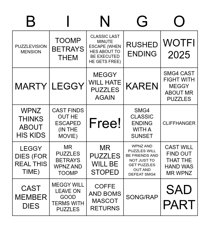 This bingo card has a free space and 24 words: MR PUZZLES BETRAYS WPNZ AND TOOMP, MEGGY WILL LEAVE ON GOOD TERMS WITH PUZZLES, MEGGY WILL HATE PUZZLES AGAIN, CAST MEMBER DIES, WOTFI 2025, PUZZLEVISION MENSION, MARTY, TOOMP BETRAYS THEM, SMG4 CLASSIC ENDING WITH A SUNSET, MR PUZZLES WILL BE STOPED, KAREN, WPNZ THINKS ABOUT HIS KIDS, WPNZ AND PUZZLES WILL BE FRIENDS AND NOT JUST TO GET PUZZLES OUT AND DEFEAT SMG4, CAST WILL FIND OUT THAT THE HAND WAS MR WPNZ, LEGGY, SONG/RAP, CLIFFHANGER, CLASSIC LAST MINUTE ESCAPE (WHEN HES ABOUT TO BE EXECUTED HE GETS FREE), SMG4 CAST FIGHT WITH MEGGY ABOUT MR PUZZLES, CAST FINDS OUT HE ESCAPED (IN THE MOVIE), SAD PART, LEGGY DIES (FOR REAL THIS TIME), RUSHED ENDING and COFFE AND BOMS MASCOT RETURNS.