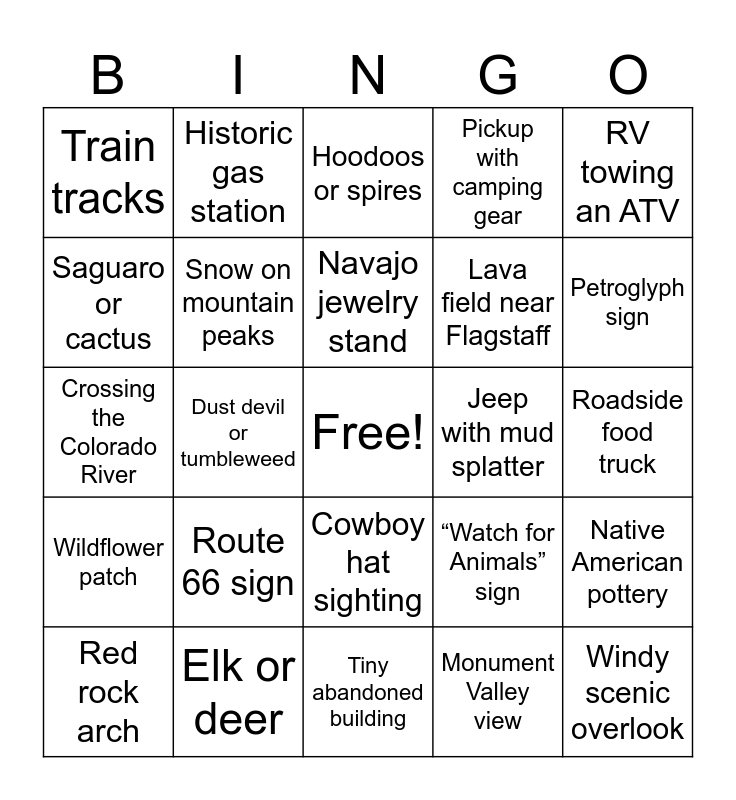 This bingo card has a free space and 24 words: Route 66 sign, Elk or deer, Navajo jewelry stand, Red rock arch, RV towing an ATV, Train tracks, Saguaro or cactus, Historic gas station, Jeep with mud splatter, Cowboy hat sighting, Lava field near Flagstaff, Crossing the Colorado River, “Watch for Animals” sign, Native American pottery, Snow on mountain peaks, Monument Valley view, Roadside food truck, Hoodoos or spires, Petroglyph sign, Dust devil or tumbleweed, Windy scenic overlook, Wildflower patch, Pickup with camping gear and Tiny abandoned building.
