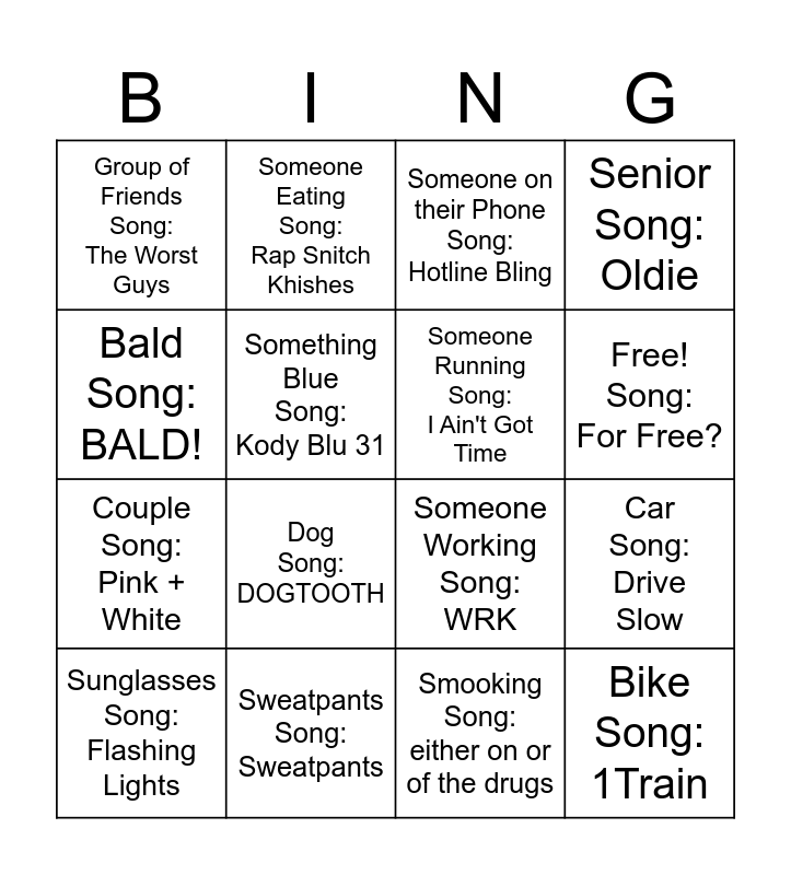 This bingo card has 18 words: Dog Song: DOGTOOTH, Bike Song: 1Train, Someone on their Phone Song: Hotline Bling, Group of Friends Song: The Worst Guys, Someone Working Song: WRK, Senior Song: Oldie, Sunglasses Song: Flashing Lights, Someone Eating Song: Rap Snitch Khishes, Free! Song: For Free?, Couple Song: Pink + White, Smooking Song: either on or of the drugs, Bald Song: BALD!, Car Song: Drive Slow, Something Blue Song: Kody Blu 31, Someone Running Song: I Ain't Got Time, A Garden Song: Man at the Garden, Sweatpants Song: Sweatpants and A Garden Song: Man at the garden.