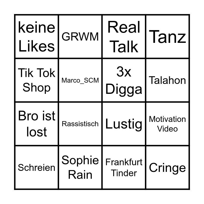 This bingo card has 16 words: Sophie Rain, Motivation Video, Real Talk, keine Likes, Bro ist lost, GRWM, Lustig, Frankfurt Tinder, Tik Tok Shop, Marco_SCM, Schreien, Tanz, Rassistisch, Talahon, 3x Digga and Cringe.