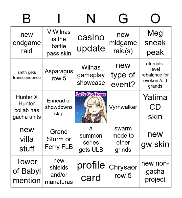 This bingo card has a free space and 24 words: Grand Sturm or Ferry FLB, new shields and/or manaturas, Wilnas gameplay showcase, Tower of Babyl mention, Meg sneak peak, new endgame raid, smth gets transcendence, V!Wilnas is the battle pass skin, Vyrnwalker, a summon series gets ULB, new type of event?, Hunter X Hunter collab has gacha units, swarm mode to other grinds, new gw skin, Asparagus row 5, Chrysaor row 5, Yatima CD skin, casino update, eternals-level rebalance for evokers/old grands, Ennead or showdowns skip, new non-gacha project, new villa stuff, new midgame raid(s) and profile card.
