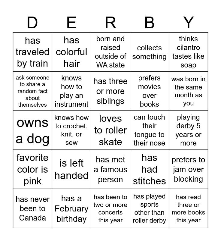 This bingo card has a free space and 34 words: playing derby 1 year or less, has played sports other than roller derby, owns a cat, does not drink coffee, favorite color is pink, knows how to play an instrument, thinks cilantro tastes like soap, has never been to Canada, has colorful hair, is an only child, has three or more siblings, born and raised outside of WA state, has a fear of heights, is a vegetarian, can touch their tongue to their nose, was born in the same month as you, has a February birthday, owns a dog, is left handed, has had stitches, has met a famous person, has broken a bone, has traveled by train, playing derby 5 years or more, has been to two or more concerts this year, has read three or more books this year, collects something, prefers books over movies, prefers movies over books, ask someone to share a random fact about themselves, likes pineapple on pizza, knows how to crochet, knit, or sew, prefers to jam over blocking and prefers to block over jamming.