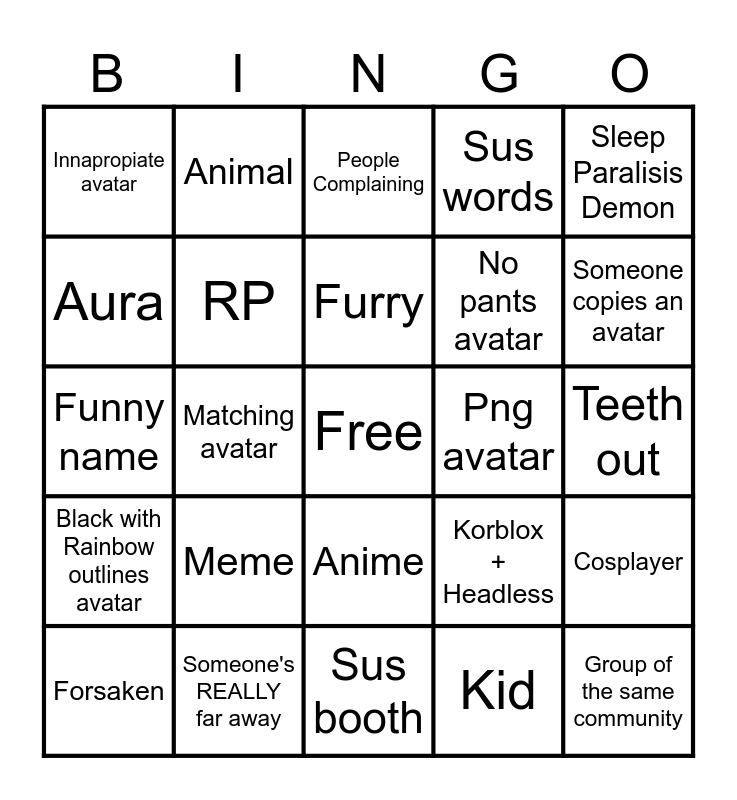 This bingo card has a free space and 24 words: Forsaken, Meme, Furry, Kid, Sleep Paralisis Demon, Innapropiate avatar, Animal, People Complaining, Png avatar, Teeth out, Funny name, RP, Korblox + Headless, Cosplayer, Aura, Someone's REALLY far away, Sus booth, Sus words, Someone copies an avatar, Black with Rainbow outlines avatar, Matching avatar, Anime, No pants avatar and Group of the same community.