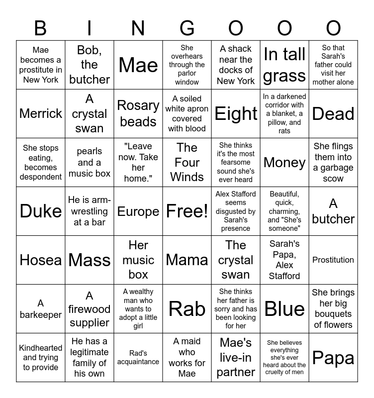 This bingo card has a free space and 62 words: They were never intended for Sarah; they were for Mae., Duke, Sarah's grandparents, pearls and a music box, Papa, She brings her big bouquets of flowers, So that Sarah's father could visit her mother alone, Alex is coming back, A crystal swan, Kindhearted and trying to provide, She overhears through the parlor window, Rab, In tall grass, Alex Stafford seems disgusted by Sarah's presence, Her ruby ring and pearls, Mae becomes a prostitute in New York, In a darkened corridor with a blanket, a pillow, and rats, A shack near the docks of New York, He takes Sarah to a man he believes wants to adopt her, Merrick, Dead, Mae, She flings them into a garbage scow, Europe, To the seashore with Cleo, The crystal swan, Mass, He's strangled, taken out as being drunk, and dumped in the river, Money, Prostitution, Cleo, A wealthy man who wants to adopt a little girl, She believes everything she's ever heard about the cruelty of men, She rips the plants up and cuts the roots of the rose bushes, She stops eating, becomes despondent, Bob, the butcher, She thinks her father is sorry and has been looking for her, Sarah's Papa, Alex Stafford, Eight, Beautiful, quick, charming, and "She's someone", A soiled white apron covered with blood, Blue, "Leave now. Take her home.", Stella, Rosary beads, She thinks it's the most fearsome sound she's ever heard, Her music box, He has a legitimate family of his own, A maid who works for Mae, Mae's live-in partner, The Four Winds, He is arm-wrestling at a bar, The sea, A firewood supplier, Rab's friend, A butcher, Mama, A barkeeper, Rad's acquaintance, Francine Rivers, Hosea and Cleo's boyfriend.