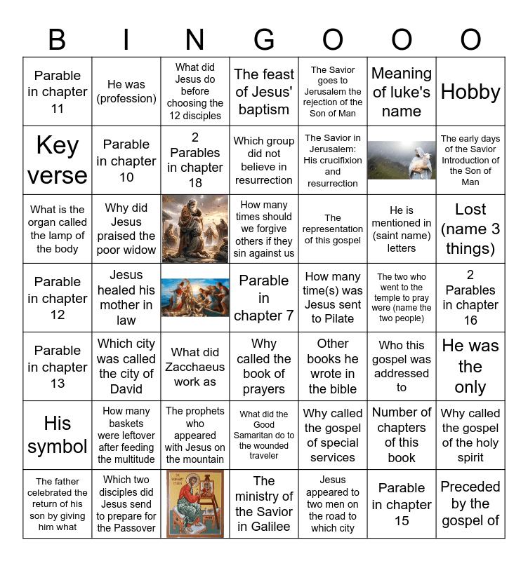 This bingo card has 5 images and 48 words: He was the only, He was (profession), Preceded by the gospel of, Meaning of luke's name, His symbol, Hobby, Other books he wrote in the bible, He is mentioned in (saint name) letters, The representation of this gospel, Number of chapters of this book, Lost (name 3 things), Key verse, The early days of the Savior Introduction of the Son of Man, The ministry of the Savior in Galilee, The Savior goes to Jerusalem the rejection of the Son of Man, The Savior in Jerusalem: His crucifixion and resurrection, Parable in chapter 7, Parable in chapter 10, Parable in chapter 11, Jesus appeared to two men on the road to which city, Parable in chapter 12, Parable in chapter 13, Parable in chapter 15, 2 Parables in chapter 16, 2 Parables in chapter 18, Why called the gospel of joy, Why called the book of prayers, Why called the gospel of special services, Why called the gospel of the holy spirit, Who this gospel was addressed to, Which city was called the city of David, The feast of Jesus' baptism, Jesus healed his mother in law, What did Jesus do before choosing the 12 disciples, How many baskets were leftover after feeding the multitude, The prophets who appeared with Jesus on the mountain, What did the Good Samaritan do to the wounded traveler, What is the organ called the lamp of the body, What makes the angels of God joyful, The father celebrated the return of his son by giving him what, How many times should we forgive others if they sin against us, The two who went to the temple to pray were (name the two people), What did Zacchaeus work as, Which group did not believe in resurrection, Why did Jesus praised the poor widow, Which two disciples did Jesus send to prepare for the Passover, How many time(s) was Jesus sent to Pilate and Jesus appeared to two men on the road to which city.