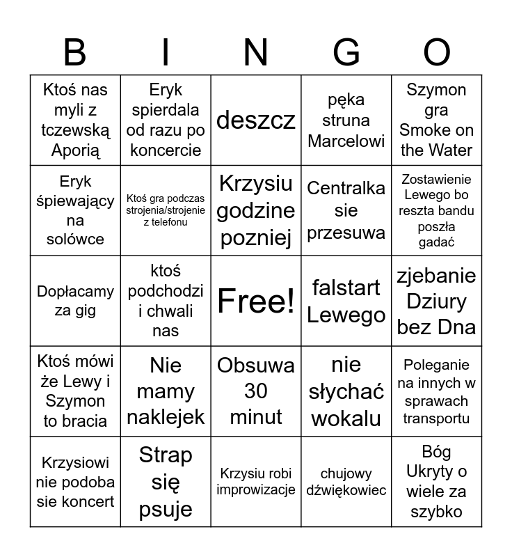 This bingo card has a free space and 24 words: Nie mamy naklejek, Strap się psuje, Krzysiu godzine pozniej, Krzysiowi nie podoba sie koncert, Szymon gra Smoke on the Water, Ktoś nas myli z tczewską Aporią, Eryk śpiewający na solówce, Eryk spierdala od razu po koncercie, falstart Lewego, Obsuwa 30 minut, Centralka sie przesuwa, Dopłacamy za gig, nie słychać wokalu, Poleganie na innych w sprawach transportu, Ktoś gra podczas strojenia/strojenie z telefonu, chujowy dźwiękowiec, zjebanie Dziury bez Dna, deszcz, Zostawienie Lewego bo reszta bandu poszła gadać, ktoś podchodzi i chwali nas, Bóg Ukryty o wiele za szybko, Ktoś mówi że Lewy i Szymon to bracia, pęka struna Marcelowi and Krzysiu robi improwizacje.