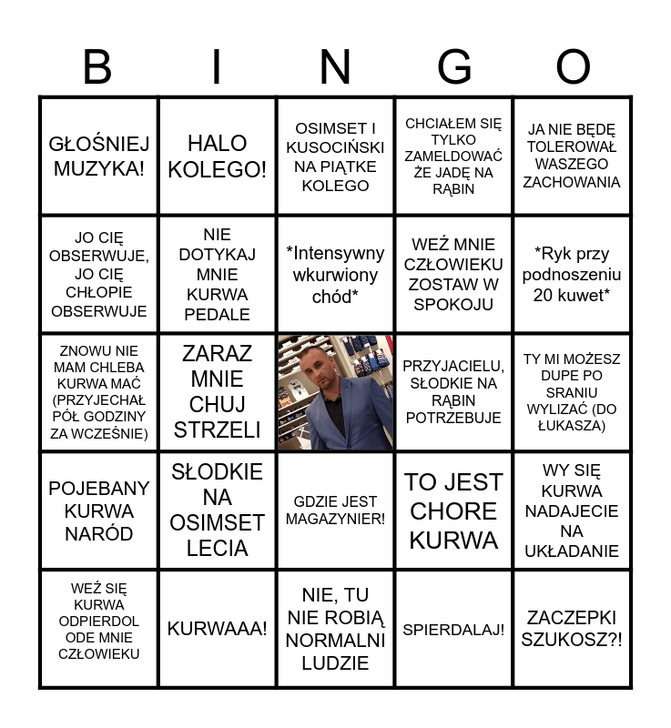 This bingo card has a free space and 24 words: SŁODKIE NA OSIMSET LECIA, KURWAAA!, *Intensywny wkurwiony chód*, WEŹ SIĘ KURWA ODPIERDOL ODE MNIE CZŁOWIEKU, JA NIE BĘDĘ TOLEROWAŁ WASZEGO ZACHOWANIA, GŁOŚNIEJ MUZYKA!, JO CIĘ OBSERWUJE, JO CIĘ CHŁOPIE OBSERWUJE, HALO KOLEGO!, PRZYJACIELU, SŁODKIE NA RĄBIN POTRZEBUJE, GDZIE JEST MAGAZYNIER!, WEŹ MNIE CZŁOWIEKU ZOSTAW W SPOKOJU, ZNOWU NIE MAM CHLEBA KURWA MAĆ (PRZYJECHAŁ PÓŁ GODZINY ZA WCZEŚNIE), TO JEST CHORE KURWA, WY SIĘ KURWA NADAJECIE NA UKŁADANIE, NIE DOTYKAJ MNIE KURWA PEDALE, SPIERDALAJ!, TY MI MOŻESZ DUPE PO SRANIU WYLIZAĆ (DO ŁUKASZA), OSIMSET I KUSOCIŃSKI NA PIĄTKE KOLEGO, *Ryk przy podnoszeniu 20 kuwet*, ZARAZ MNIE CHUJ STRZELI, ZACZEPKI SZUKOSZ?!, POJEBANY KURWA NARÓD, CHCIAŁEM SIĘ TYLKO ZAMELDOWAĆ ŻE JADĘ NA RĄBIN and NIE, TU NIE ROBIĄ NORMALNI LUDZIE.