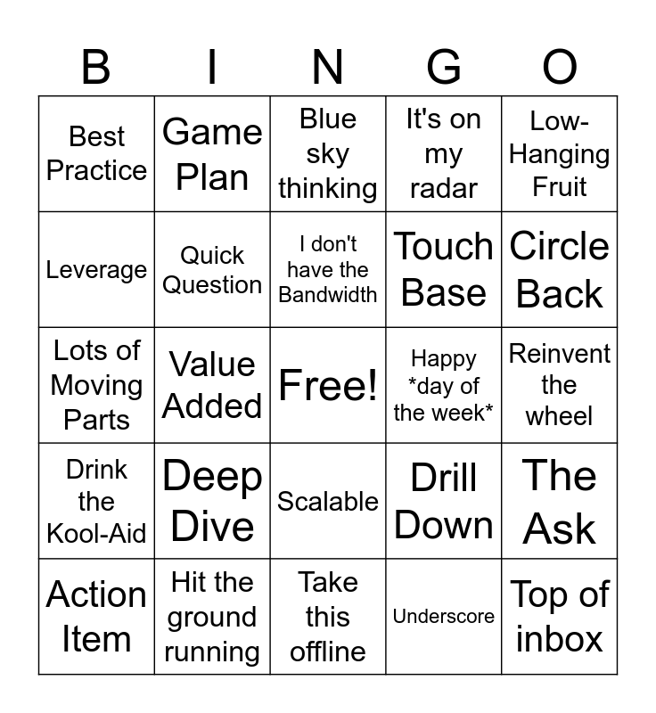 This bingo card has a free space and 24 words: Deep Dive, Hit the ground running, I don't have the Bandwidth, Action Item, Low-Hanging Fruit, Best Practice, Leverage, Game Plan, Happy *day of the week*, Scalable, Touch Base, Lots of Moving Parts, Drill Down, The Ask, Quick Question, Underscore, Reinvent the wheel, Blue sky thinking, Circle Back, Value Added, Top of inbox, Drink the Kool-Aid, It's on my radar and Take this offline.