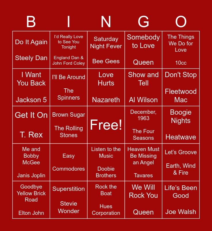 This bingo card has a free space and 118 words: Bridge Over Troubled Water Simon & Garfunkle, More Than a Feeling Boston, Take It Easy Eagles, Papa Was a Rollin' Stone The Temptations, Ain't No Sunshine Bill Withers, Love Train The O'Jays, Somebody to Love Queen, You Are the Sunshine of My Life Stevie Wonder, Heart of Glass Blondie, Dust in the Wind Kansas, Brick House Commodores, Born to Run Bruce Springsteen, My Sharona The Knack, The Joker Steve Miller Band, Hot Stuff Donna Summer, Turn the Beat Around Vicki Sue Robinson, Listen to the Music Doobie Brothers, Shining Star Earth, Wind & Fire, Reunited Peaches & Herb, Mamma Mia ABBA, Goodbye Yellow Brick Road Elton John, Saturday Night Fever Bee Gees, Midnight Train to Georgia Gladys Knight & the Pips, Low Rider War, Stayin' Alive Bee Gees, Me and Bobby McGee Janis Joplin, Superstition Stevie Wonder, Let's Stay Together Al Green, Band on the Run Paul McCartney, Fire and Rain James Taylor, Don't Stop Fleetwood Mac, Love Hurts Nazareth, Brown Sugar The Rolling Stones, Stay With Me Faces, Black Dog Led Zeppelin, Cat's in the Cradle Harry Chapin, Sultans of Swing Dire Straits, You Sexy Thing Hot Chocolate, I Can See Clearly Now Johnny Nash, Have You Ever Seen the Rain CCR, What's Going On Marvin Gaye, Crocodile Rock Elton John, Fooled Around and Fell in Love Elvin Bishop, Still the One Orleans, Walk This Way Aerosmith, Love Rollercoaster Ohio Players, We Will Rock You Queen, I Want You Back Jackson 5, Rock and Roll All Nite Kiss, No Woman No Cry Bob Marley, Bad, Bad Leroy Brown Jim Croce, December, 1963 The Four Seasons, Crazy Love Van Morrison, Sundown Gordon Lightfoot, So Far Away Carole King, Sister Golden Hair America, Rock With You Michael Jackson, Do Ya Electric Light Orchestra, Peaceful Easy Feeling Eagles, Rich Girl Hall & Oates, Let’s Groove Earth, Wind & Fire, You Make Loving Fun Fleetwood Mac, You’re So Vain Carly Simon, All Right Now Free, Magic Pilot, O-o-h Child Five Stairsteps, How Deep Is Your Love Bee Gees, I'll Be Around The Spinners, Get It On T. Rex, Rock the Boat Hues Corporation, Boogie Nights Heatwave, Take the Long Way Home Supertramp, Baker Street Gerry Rafferty, Goodbye to Love Carpenters, Fox on the Run Sweet, I’d Really Love to See You Tonight England Dan & John Ford Coley, Life’s Been Good Joe Walsh, Easy Commodores, Do It Again Steely Dan, Blinded by the Light Manfred Mann's Earth Band, Moonlight Feels Right Starbuck, Fire The Pointer Sisters, Got to Give It Up Marvin Gaye, Don’t Pull Your Love Hamilton, Joe Frank & Reynolds, Heaven Must Be Missing an Angel Tavares, You Belong to Me Carly Simon, Show and Tell Al Wilson, She's Gone Hall & Oates, Take Me Home, Country Roads John Denver, If You Want Me to Stay Sly & the Family Stone, Long Train Runnin’ The Doobie Brothers, Mr. Blue Sky Electric Light Orchestra, Use Me Bill Withers, Don’t Let Me Be Misunderstood Santa Esmeralda, Year of the Cat Al Stewart, The Things We Do for Love 10cc, Reminiscing Little River Band, Don’t Stop Til You Get Enough Michael Jackson, Love Is the Drug Roxy Music, Let’s Get It On Marvin Gaye, Call Me Blondie, Baby Come Back Player, Turn to Stone Electric Light Orchestra, Rock On David Essex, On and On Stephen Bishop, Raindrops Keep Fallin’ on My Head B.J. Thomas, Let It Be The Beatles, American Pie Don McLean, Lean On Me Bill Withers, Angie Rolling Stones, Rock the Boat Hues Corporation, Bennie and the Jets Elton John, Sundown Gordon Lightfoot, Summer Nights Olivia Newton-John & John Travolta, Stayin’ Alive Bee Gees, I Will Survive Gloria Gaynor, My Sharona The Knack and Hotel California Eagles.